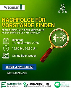 Die Europa-Union Deutschland (EUD) ist die größte Bürgerinitiative für Europa in Deutschland. Unabhängig von Parteizugehörigkeit, Alter und Beruf engagieren wir uns für die europäische Einigung. Wir sind aktiv auf lokaler, regionaler, nationaler und europäischer Ebene. Rund 17.000 Mitglieder sind in 16 Landesverbänden mit mehr als 200 Kreis-, Orts- und Stadtverbänden vernetzt und haben Partnerorganisationen in über 30 Ländern Europas. Mehr zu unseren Zielen und Aktivitäten.