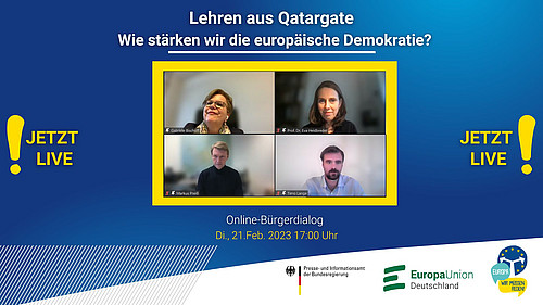 Mehr als 70 Teilnehmende nahmen die Gelegenheit wahr und diskutierten mit Gabriele Bischoff MdEP, u.a. Stellvertretende Vorsitzende des Ausschusses für konstitutionelle Fragen im Europäischen Parlament, Prof. Dr. Eva Heidbreder, Professorin für Politikwissenschaft an der Otto-von-Guericke-Universität Magdeburg, Timo Lange, Kampagnenleiter bei LobbyControl, und Markus Preiß, Leiter des ARD-Europastudios in Brüssel, über die Auswirkungen des EU-Korruptionsskandals „Qatargate“ auf die europäische Demokratie.