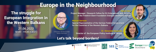 Bringen Sie Ihre Anliegen und Fragen ein beim ersten Online-Bürgerdialog unserer neuen Reihe "Europa in der Nachbarschaft - Wir müssen reden!". Diskutieren Sie am 21. Juni 2023 von 18:00 bis 19:30 Uhr zum Thema "Europe in the Neighbourhood - Let's talk beyond borders! The struggle for European Integration in the Western Balkans" mit Manuel Sarrazin, Sondergesandter der Bundesregierung für die Länder des Westlichen Balkans, Dr. Simonida Kacarska, Direktorin des European Policy Institute Skopje sowie Harun Cero, Projektmanager und…