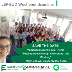 Nach vierjähriger Pause veranstalten JEF und Europa-Union vom 30. Juni bis 2. Juli 2023 wieder eine Verbandsentwicklungs-Akademie, bei der sich Aktive aus dem gesamten Bundesgebiet treffen. Im Fokus des praxisorientierten Wochenendseminars stehen die Mitgliedergewinnung, die Bindung und Aktivierung von Mitgliedern sowie die Widerstandsfähigkeit im Ehrenamt.