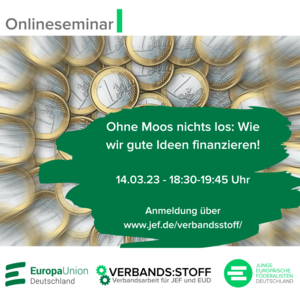 Wer kennt das nicht? Man hat eine gute Projektidee oder möchte eine Studienfahrt organisieren, aber das Geld fehlt. Im Dickicht von öffentlichen Förderern, Stiftungen und Jugendwerken verheddert man sich leicht. Wie finde ich die richtige Förderung für mein Vorhaben? Darum geht es bei der JEF-EUD Verbands:stoff Online-Akademie am 14. März 2023 von 18:30 bis 19:45 Uhr.