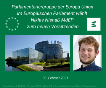 Am 03.02.2021 wählten die 63 Mitglieder der Europa-Union Parlamentariergruppe im Europäischen Parlament einen neuen Vorstand. Der neue Vorsitzende, der Abgeordnete Niklas Nienaß, kündigte eine enge Zusammenarbeit mit dem Brüsseler Verband der Europa-Union sowie mit dem Bundesverband der JEF an. Nienaß (Grüne) zur Seite stehen als Stellvertretende Vorsitzende Hildegard Bentele (CDU), Europa-Union Vizepräsidentin Gabriele Bischoff (SPD), der langjährige Europa-Union Landesvorsitzende Bayern Markus Ferber (CSU) und Andreas Glück (FDP).