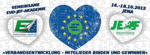 Die Europa-Union und die JEF für die Zukunft fit machen! Das ist das Ziel der gemeinsamen Akademie am 17. und 18. Oktober 2015 in Jena. Aktive aus EUD und JEF arbeiten gemeinsam zwei Tage lang an Ideen und Formaten für die Zukunft. Denn Herausforderungen gibt es genug: Wie dem demographischer Wandel begegnen? Und wie Mitglieder gewinnen und binden? Eins ist sicher: Nur gemeinsam können EUD und JEF vorankommen.