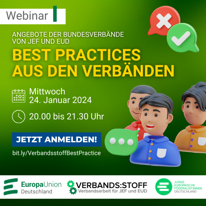 Welche Angebote für die Verbandsarbeit gibt es seitens der Bundesverbände von JEF und EUD für Landes- und Kreisverbände? Wie lassen sich diese für die Europawahlkampagne 2024 nutzen? Welche Materialien gibt es? Was plant Ihr im Vorfeld der Europawahl? Wie könnt Ihr best practices am wirkungsvollsten im Verband weitergeben?